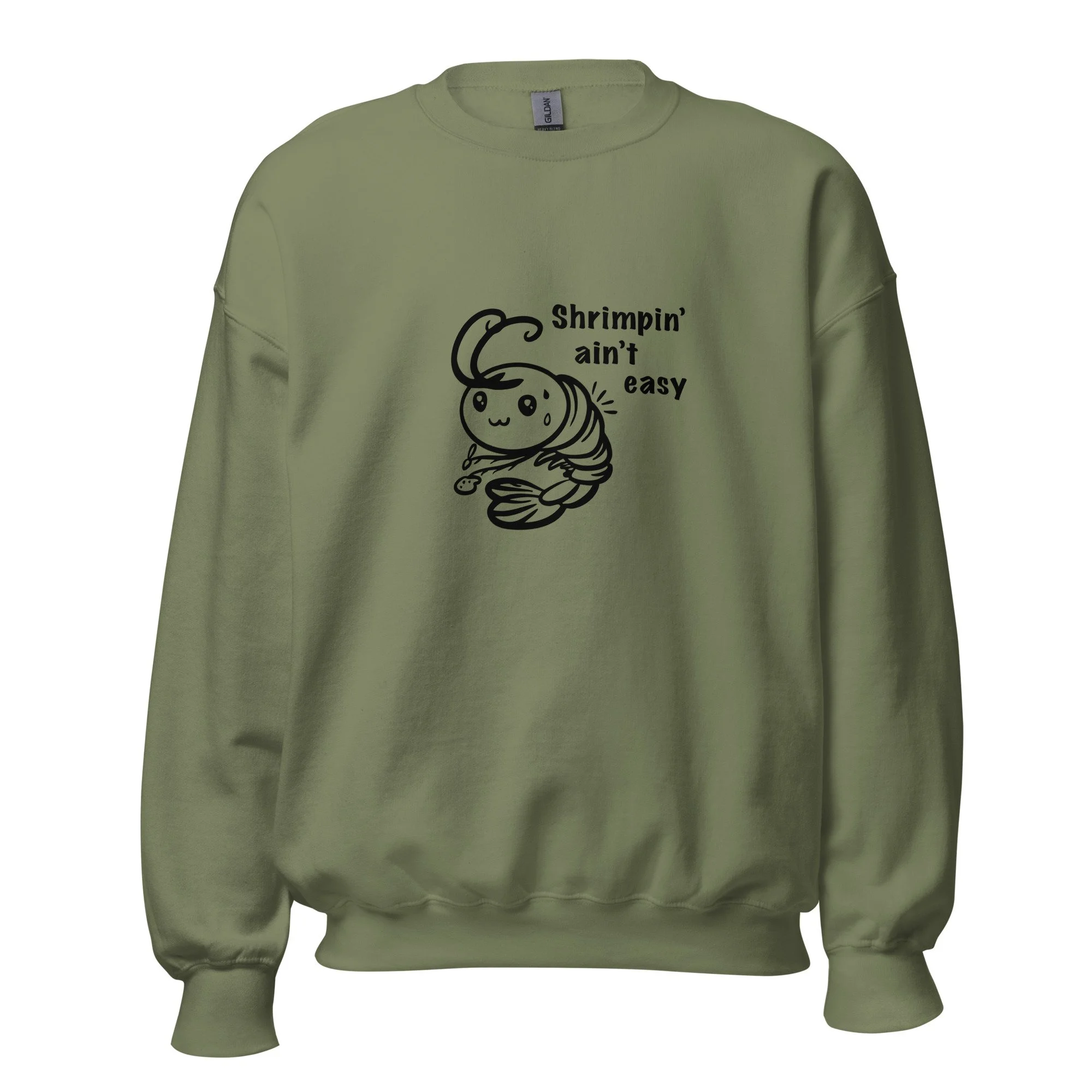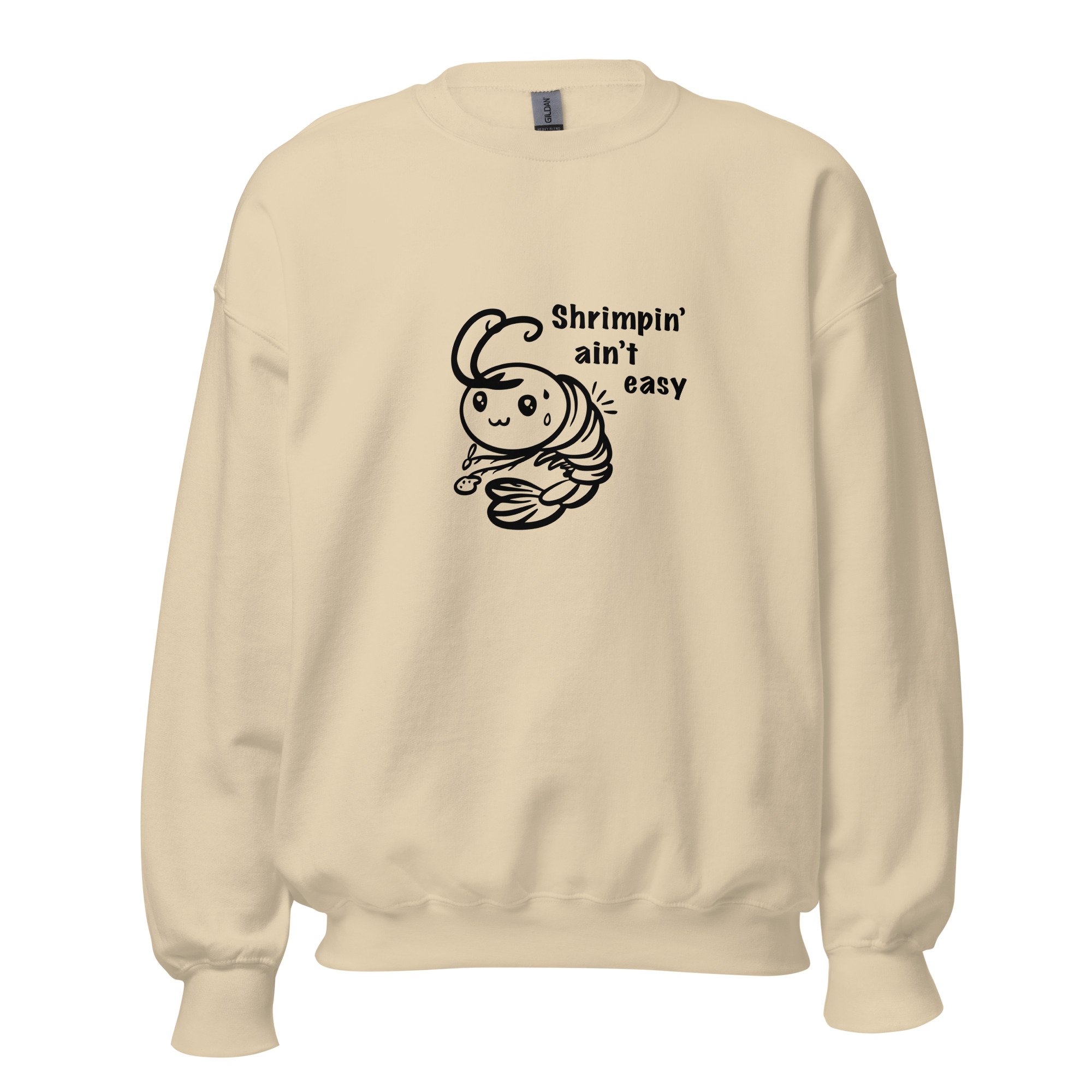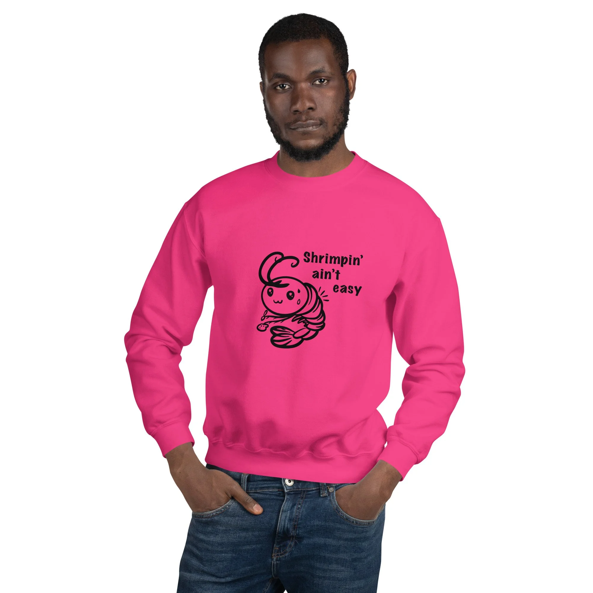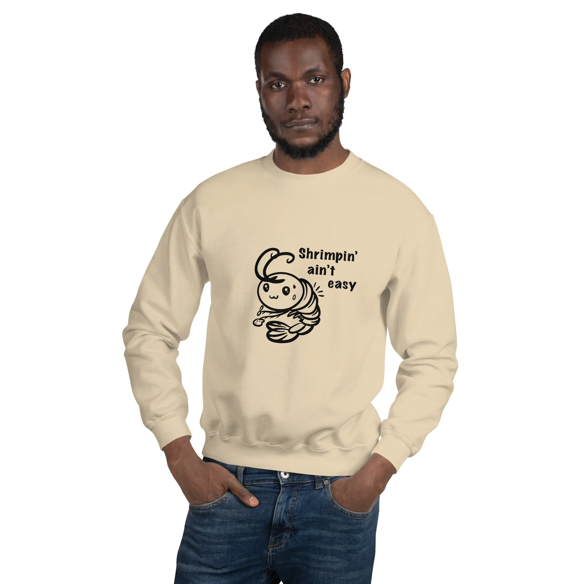 “Shrimping ain’t easy.” It’s a playful nod to the artist’s life—long hours bent over work, aching backs, and stubborn dedication—turned into a seafood-sized joke.