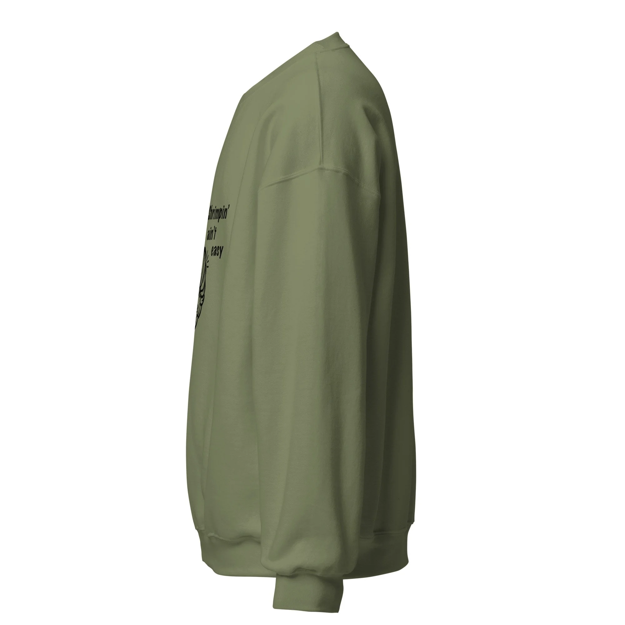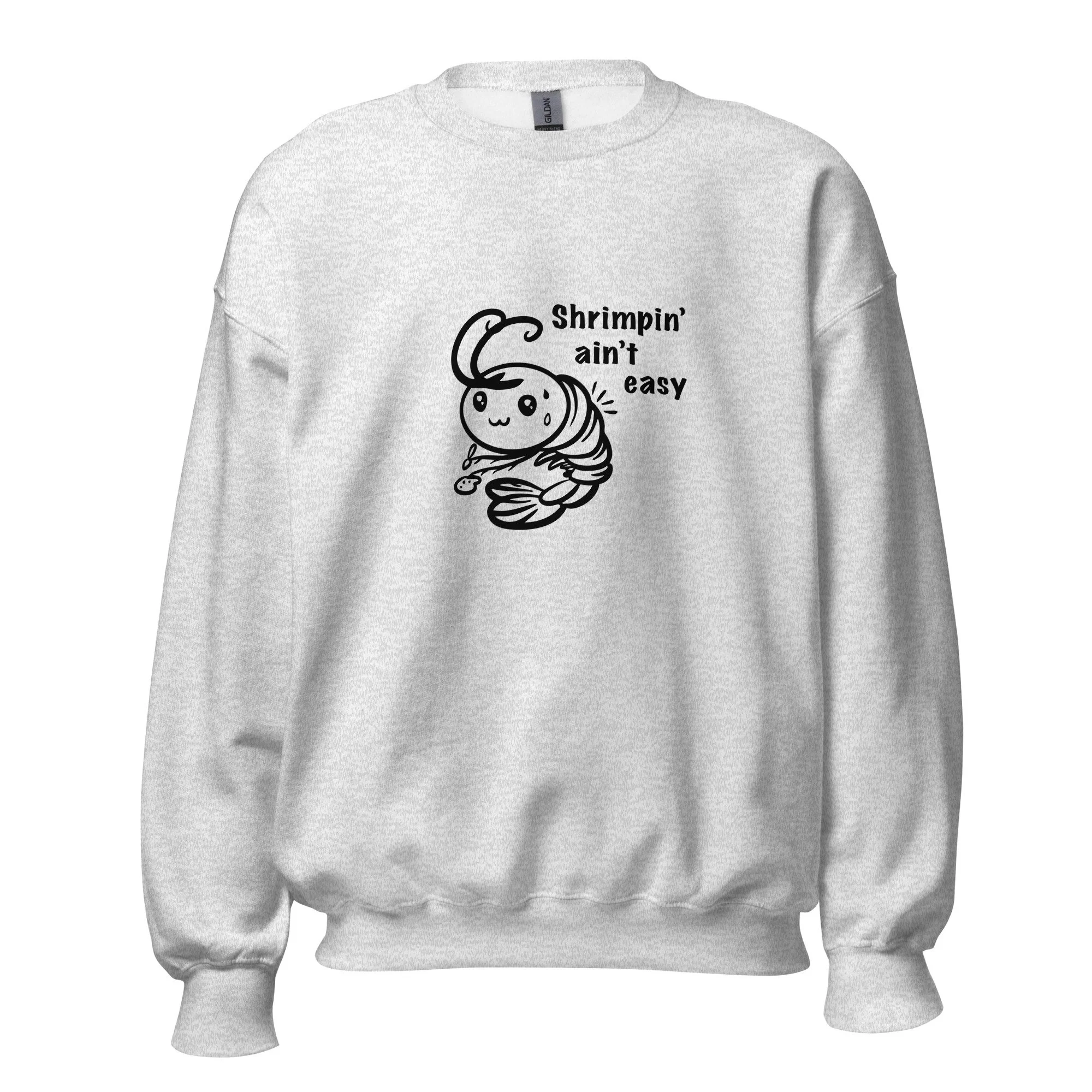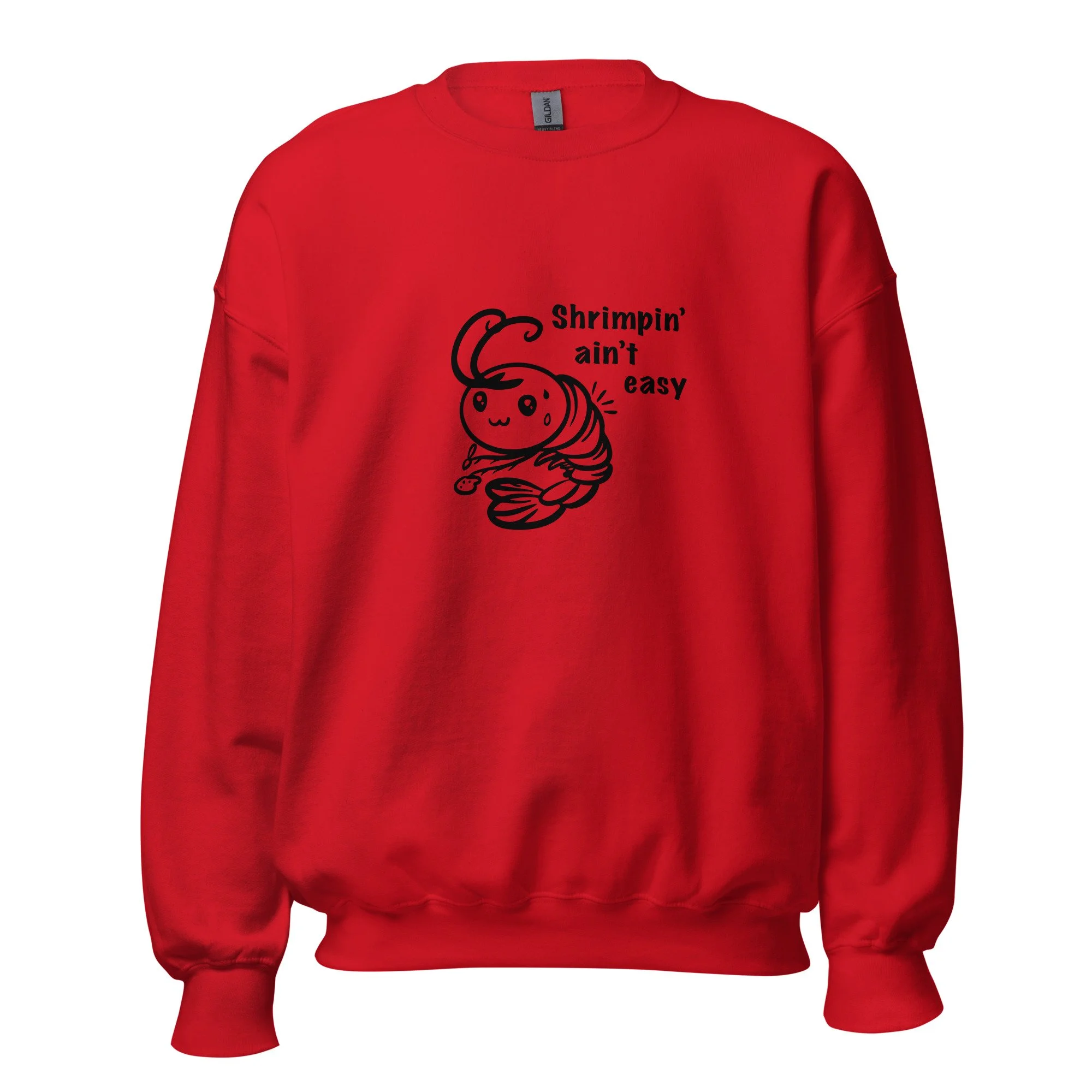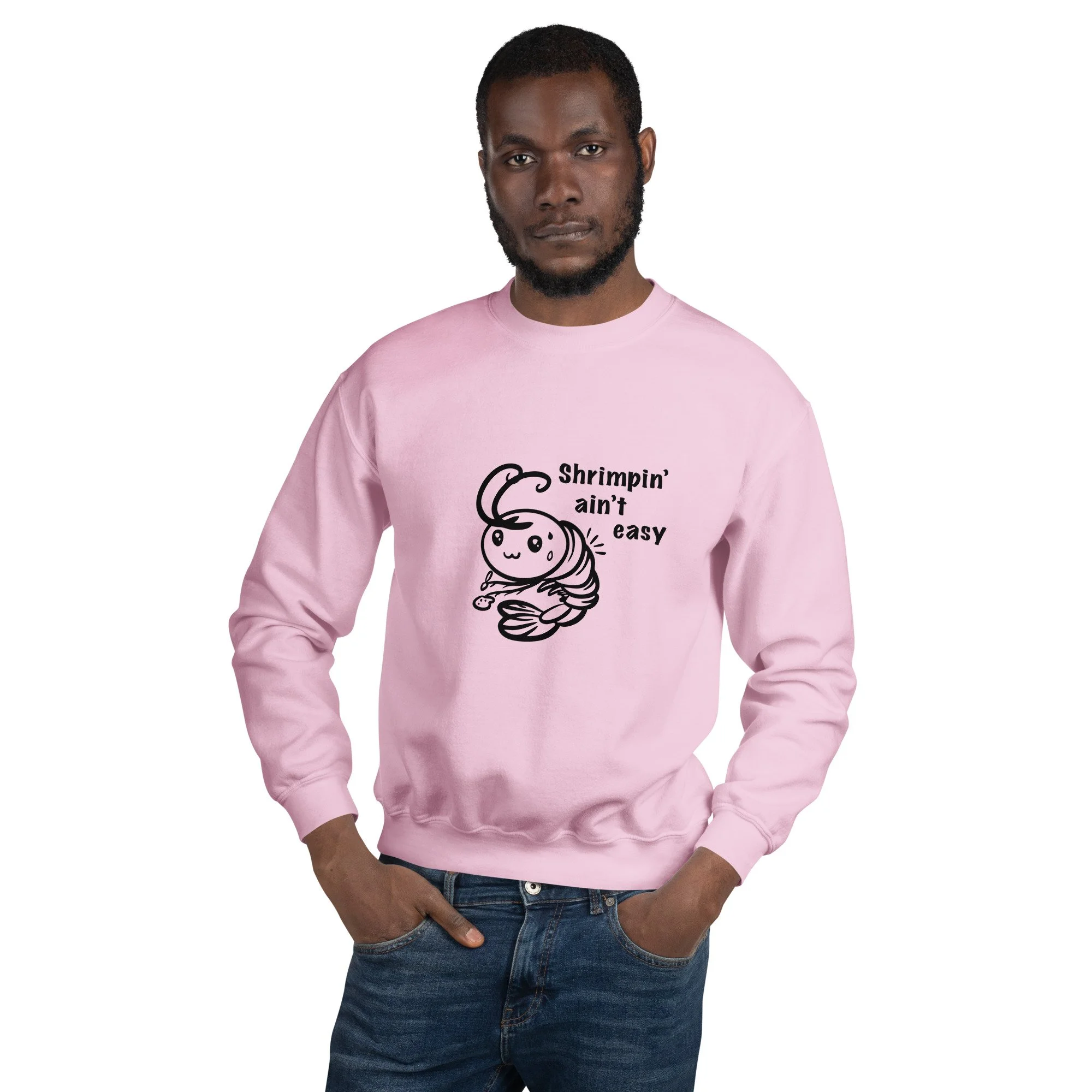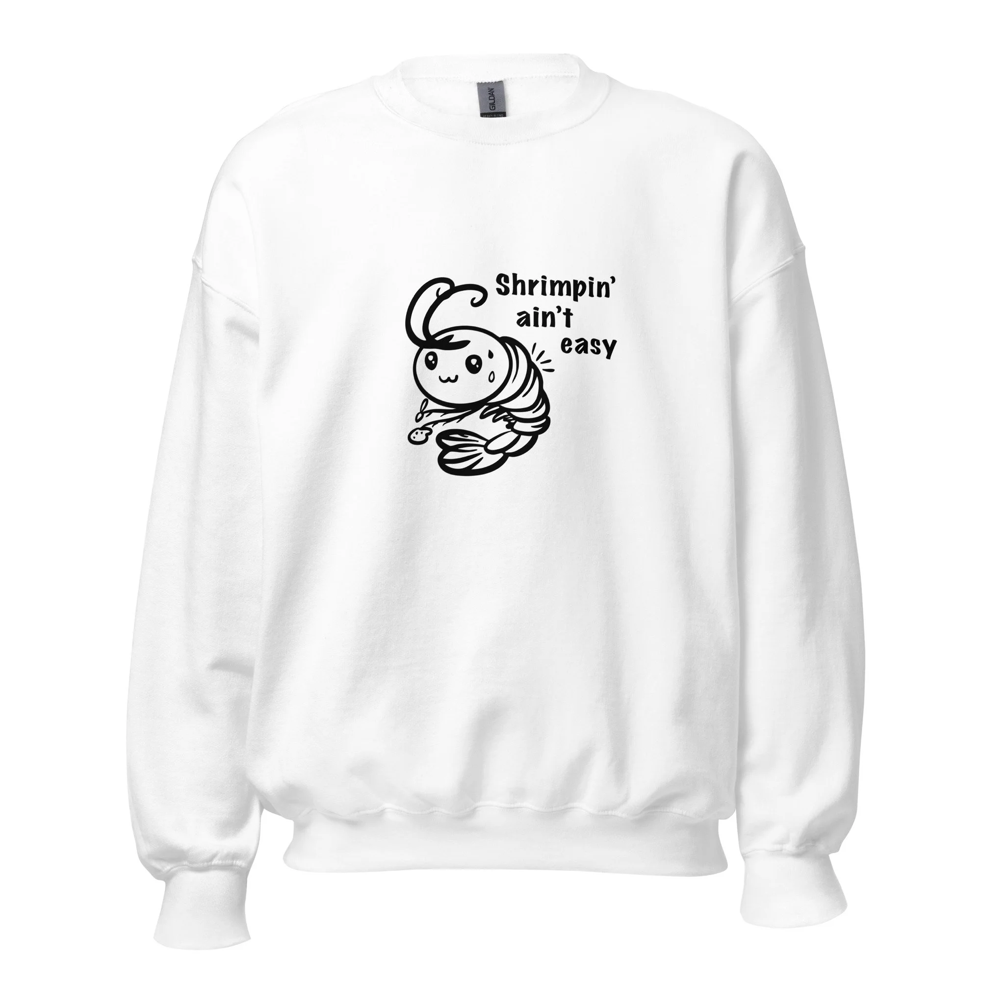 “Shrimping ain’t easy.” It’s a playful nod to the artist’s life—long hours bent over work, aching backs, and stubborn dedication—turned into a seafood-sized joke.